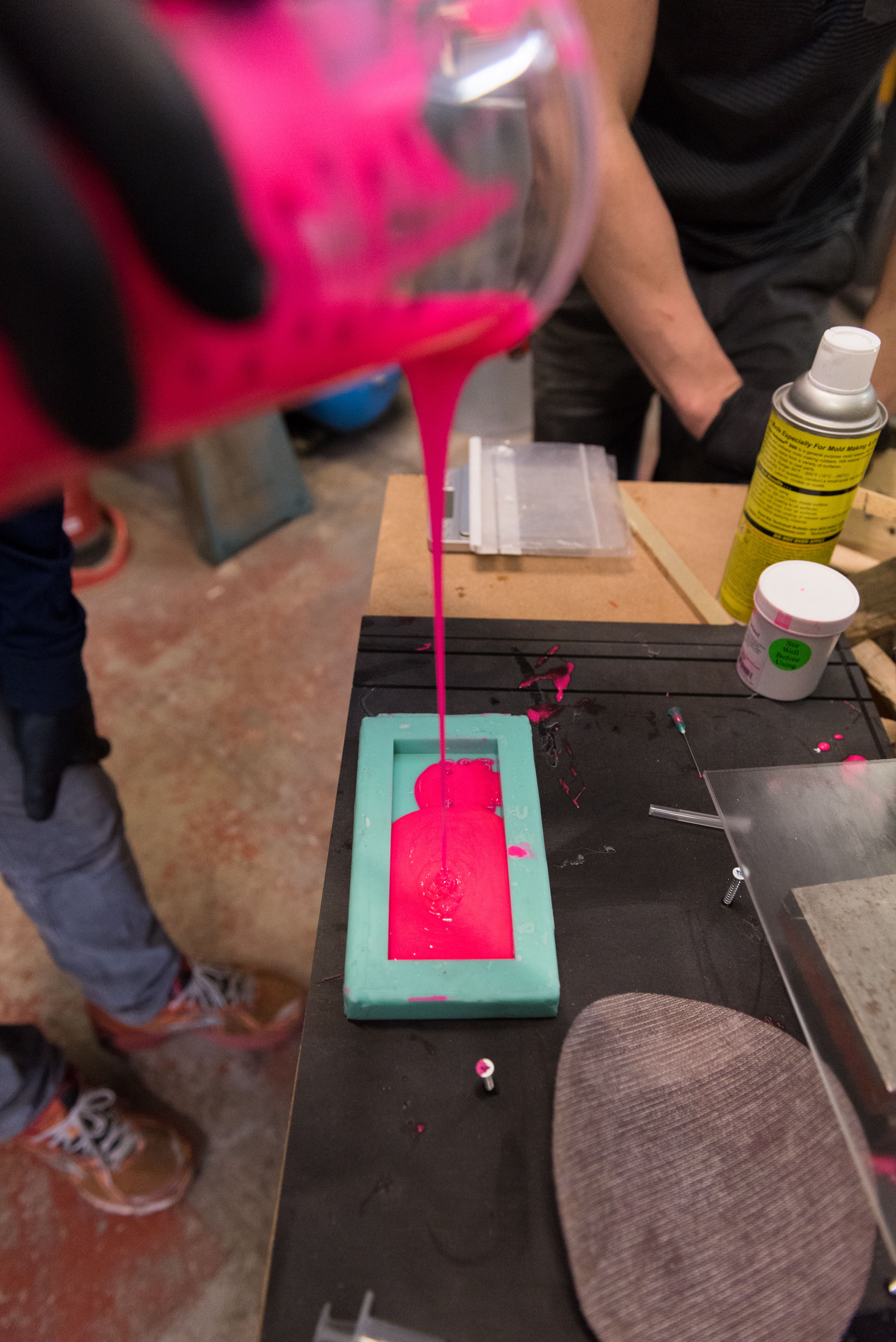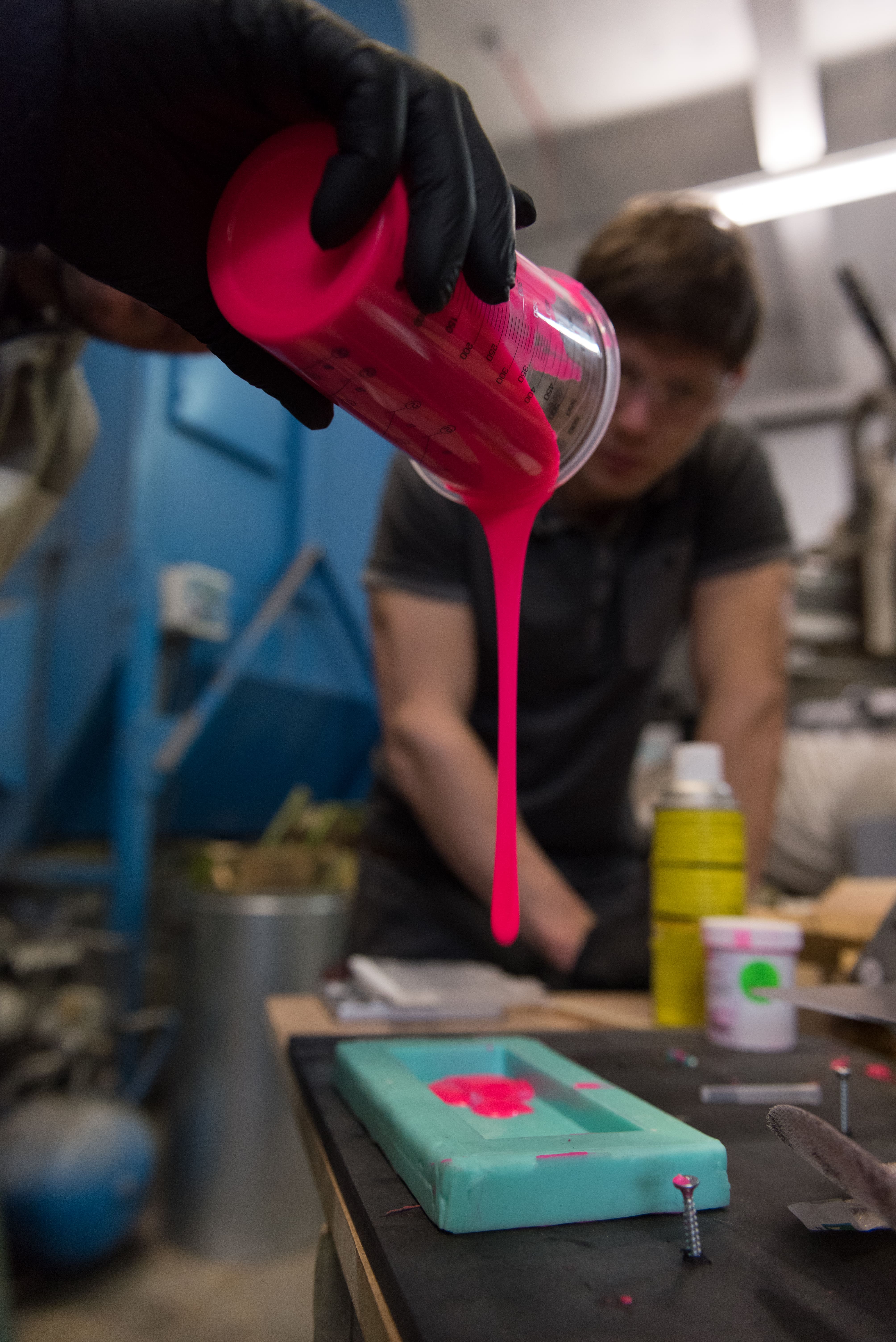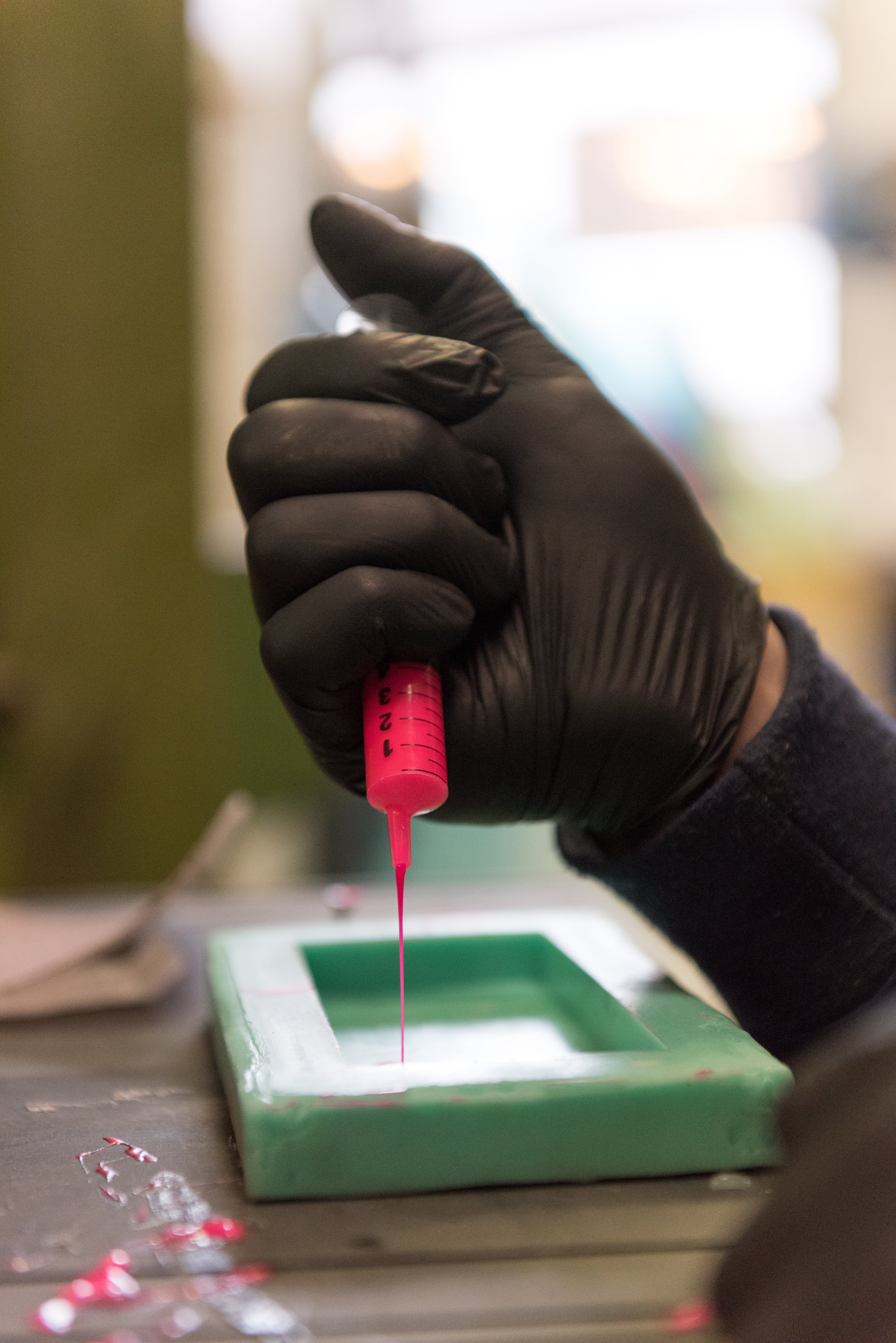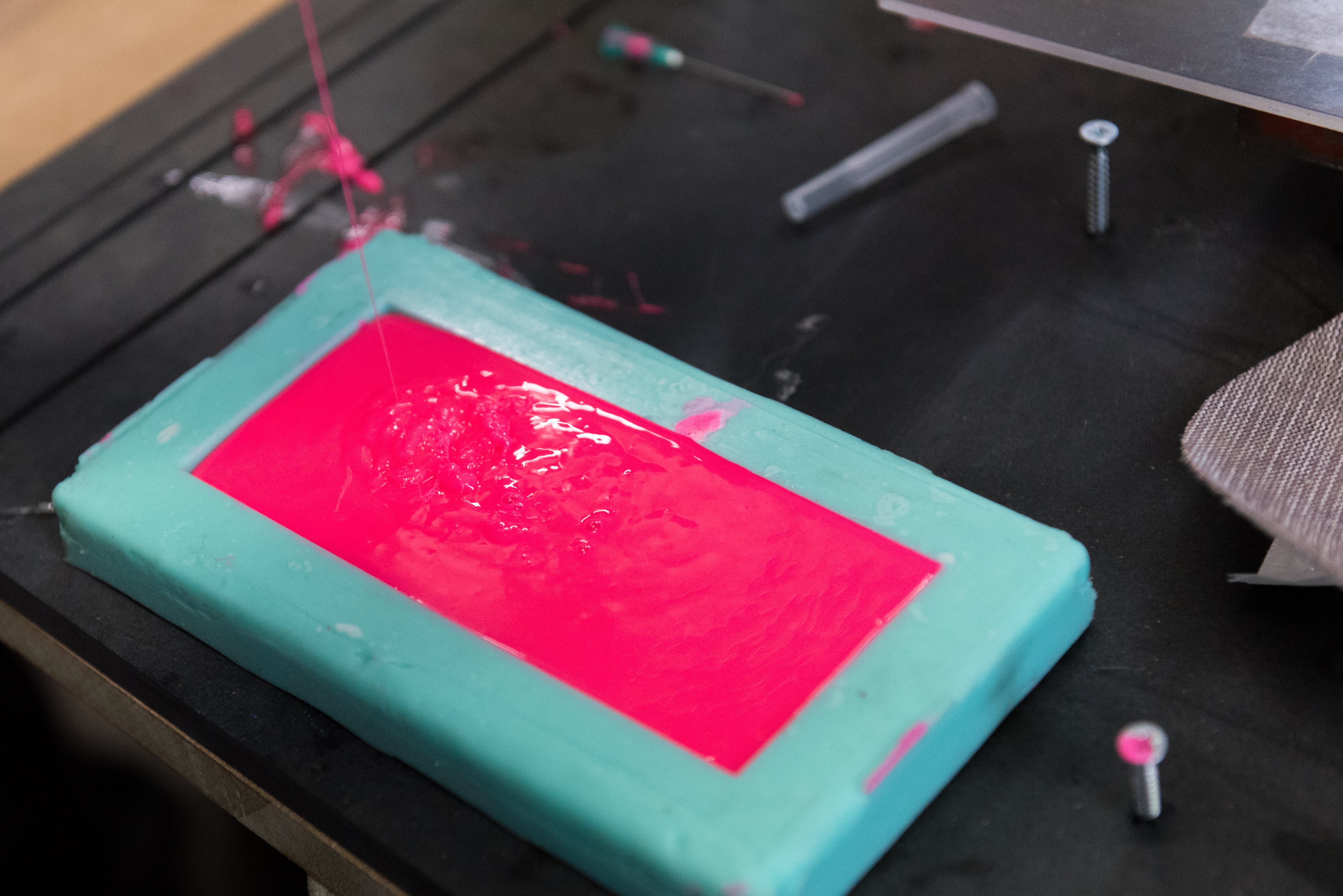 The silicon parts were made by creating a laser-cut acrylic positive master, from which we produced a negative former.