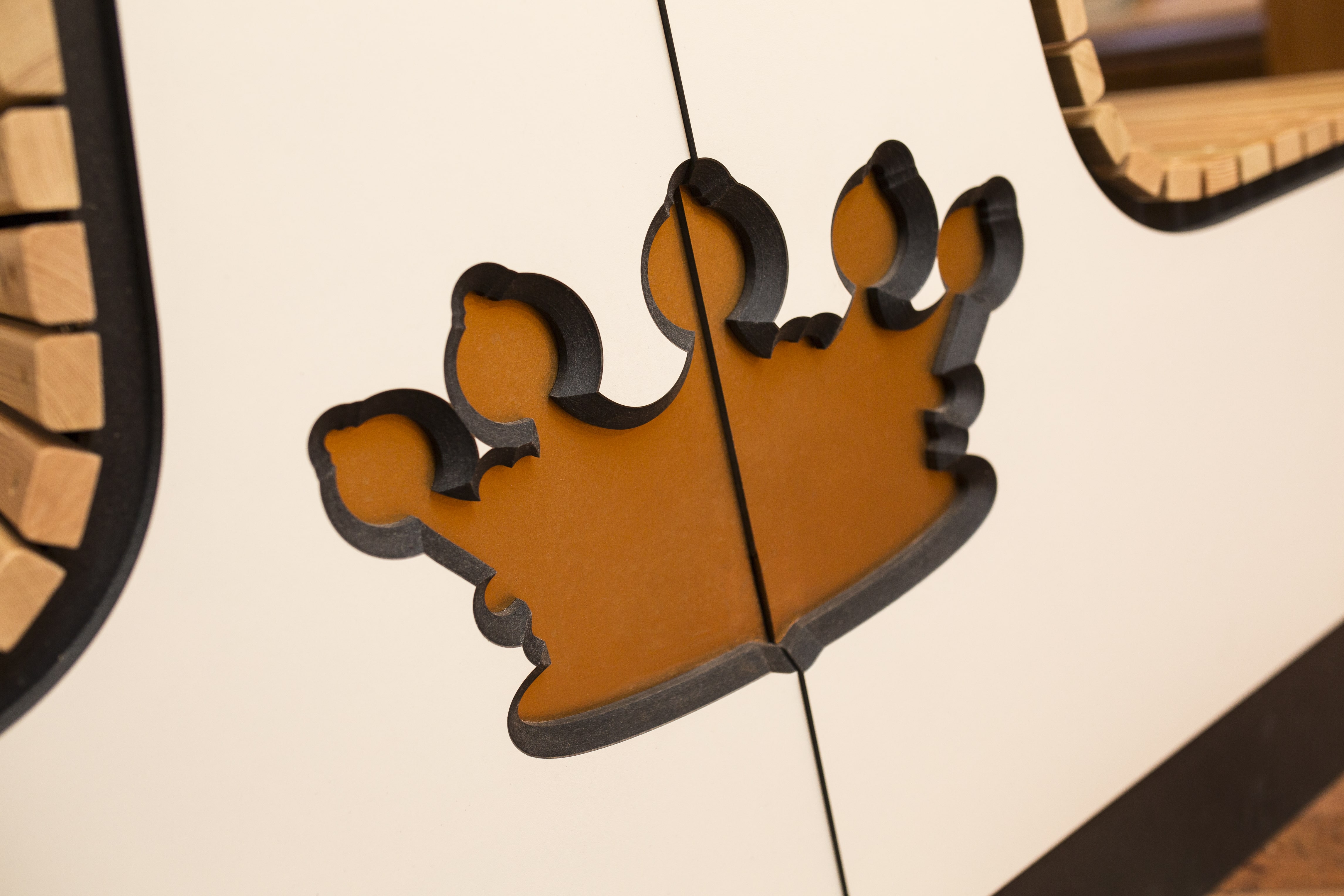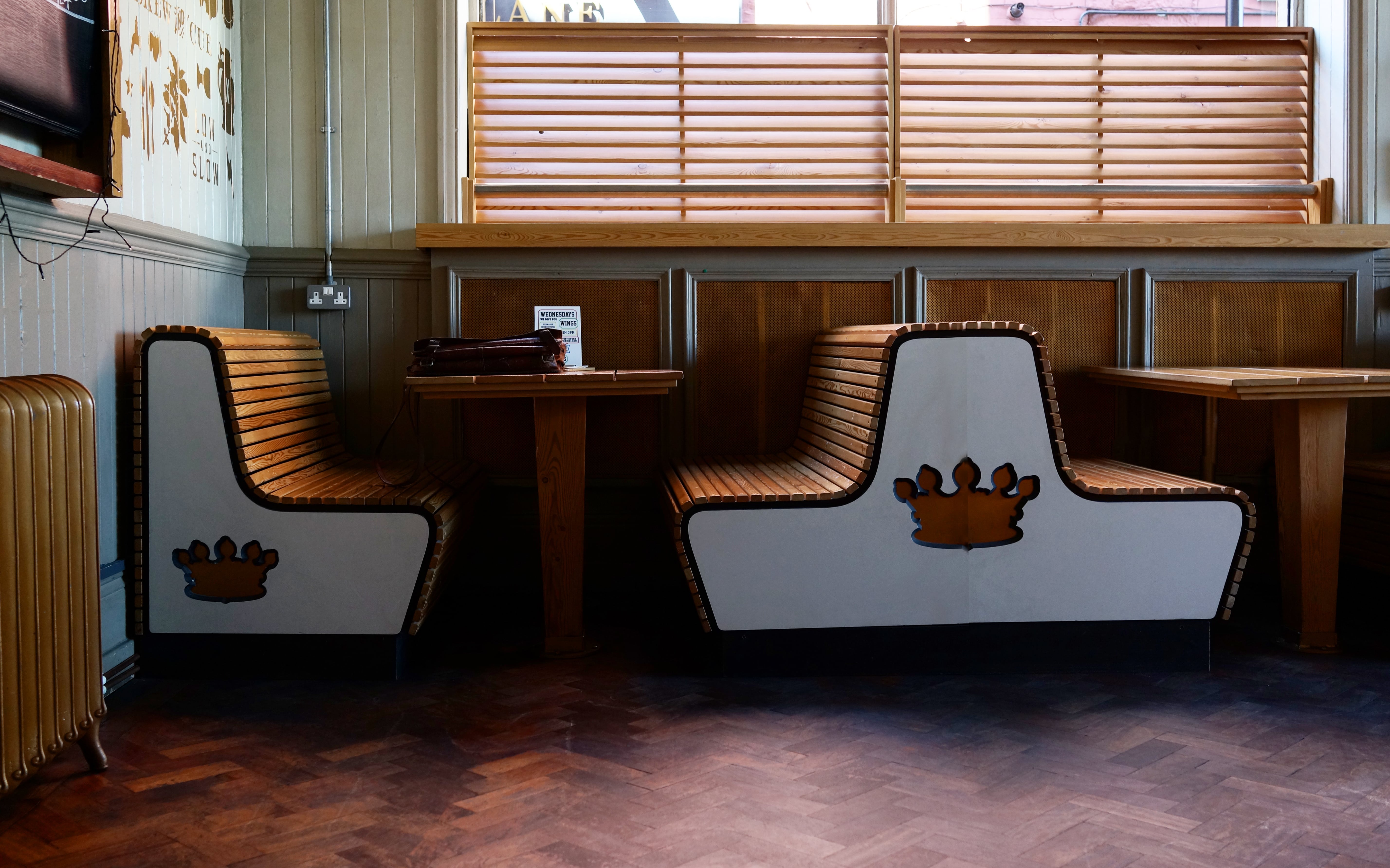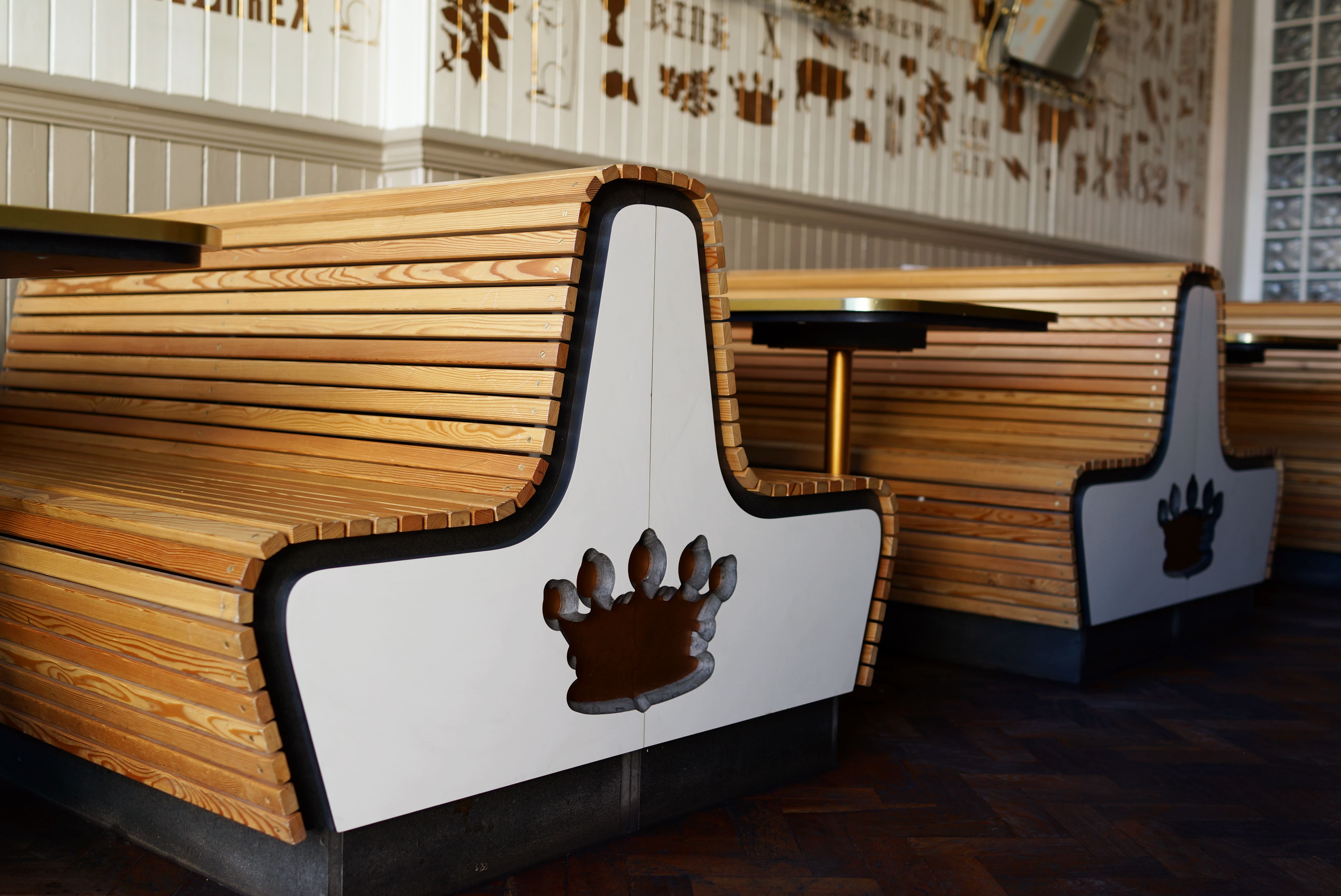 We used a combination of Siberian larch and black Valchromat to create the main bar, tapered table bases, slatted curved benches (which also feature a CNC routed crown design in gold framed by oyster-coloured HPL), wooden shutters, dining table tops, poseur ledges, menu storage and signs.