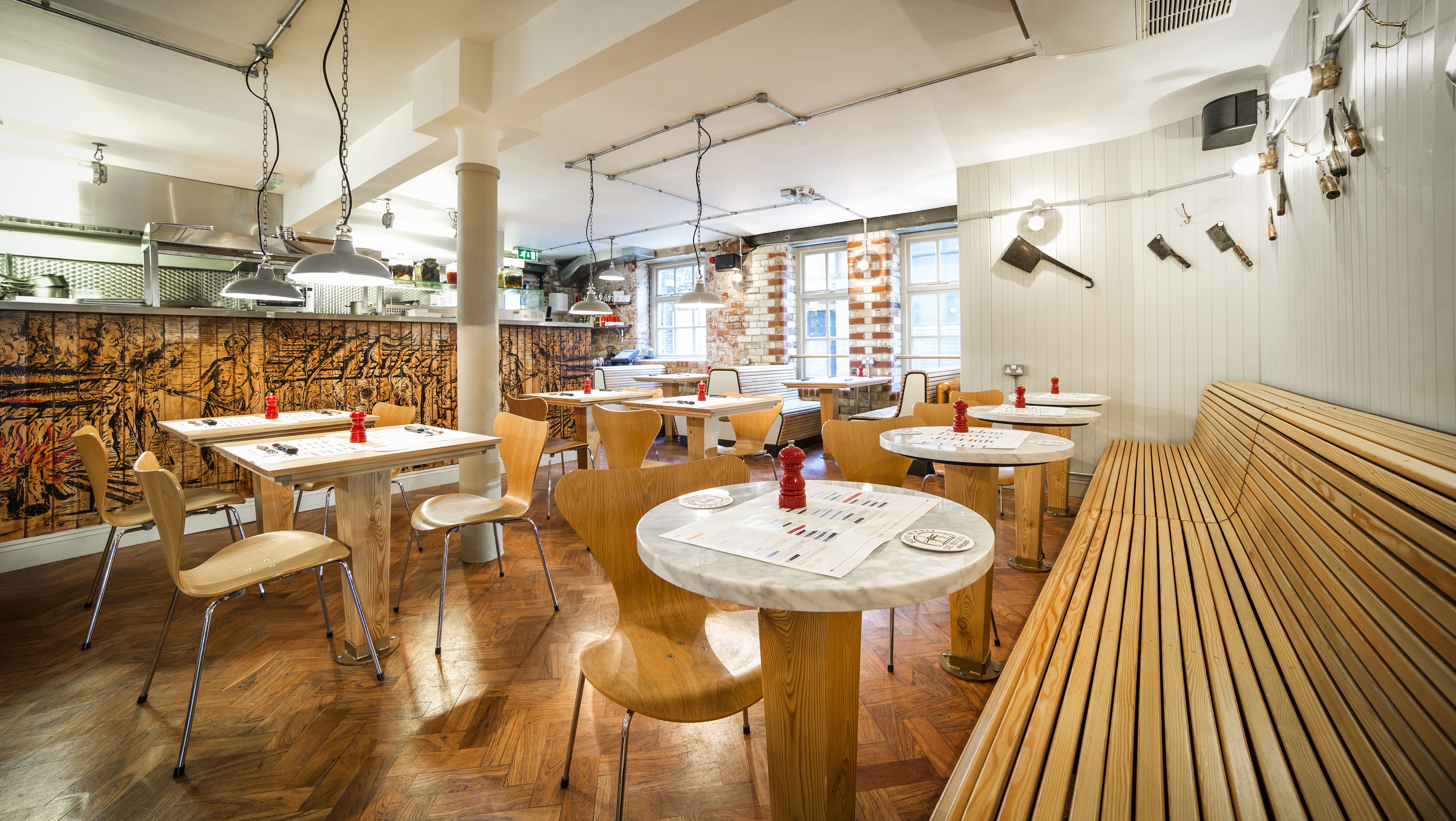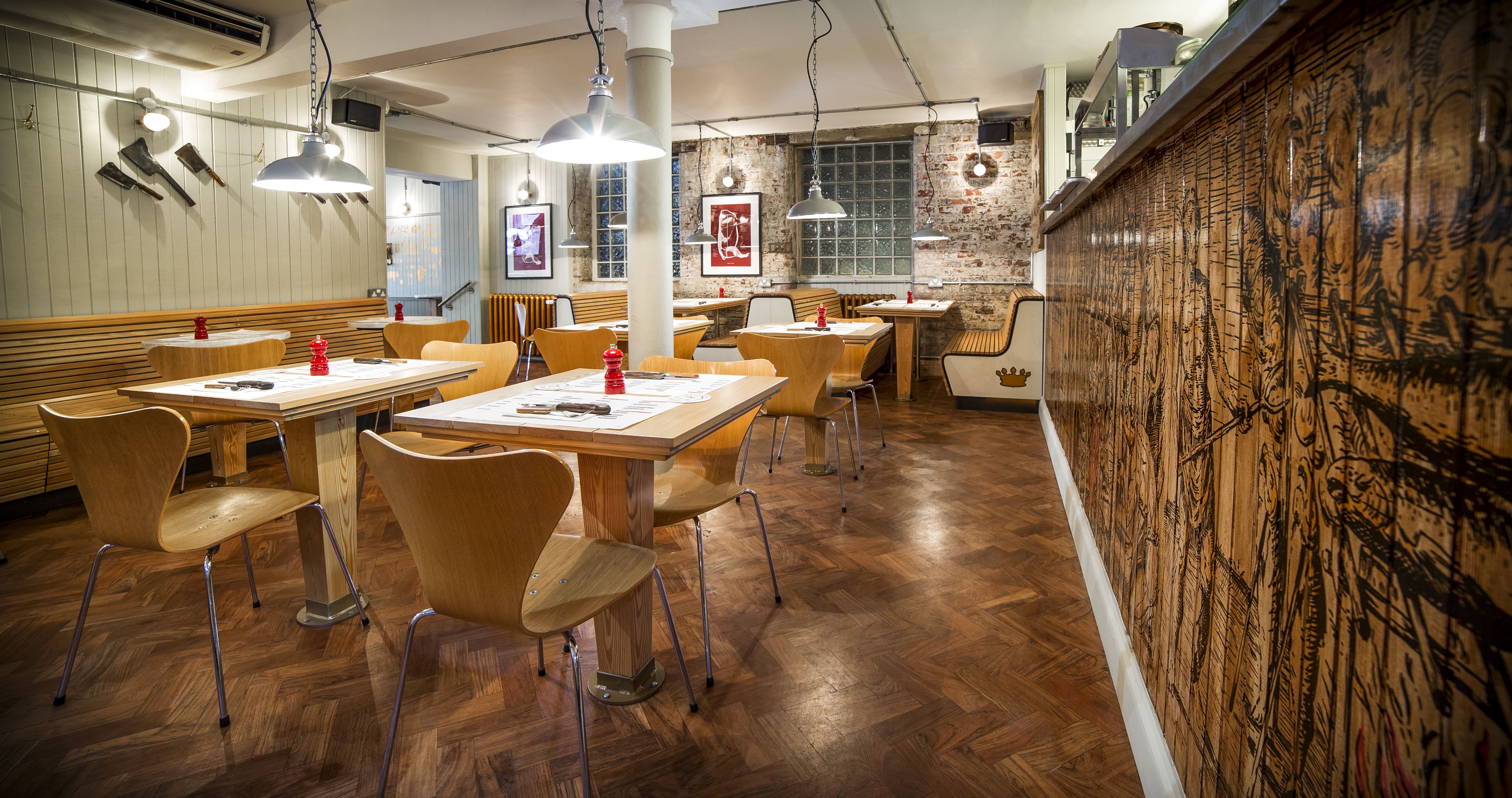 This mix of materials is perfectly complemented by Carrera marble work surfaces. We also kitted out the Poison Cabinet basement bar with black Valchromat furniture throughout with subtle larch detailing - the flip of what's happening upstairs. We even fashioned mock cleavers for door handles in polished aluminium.