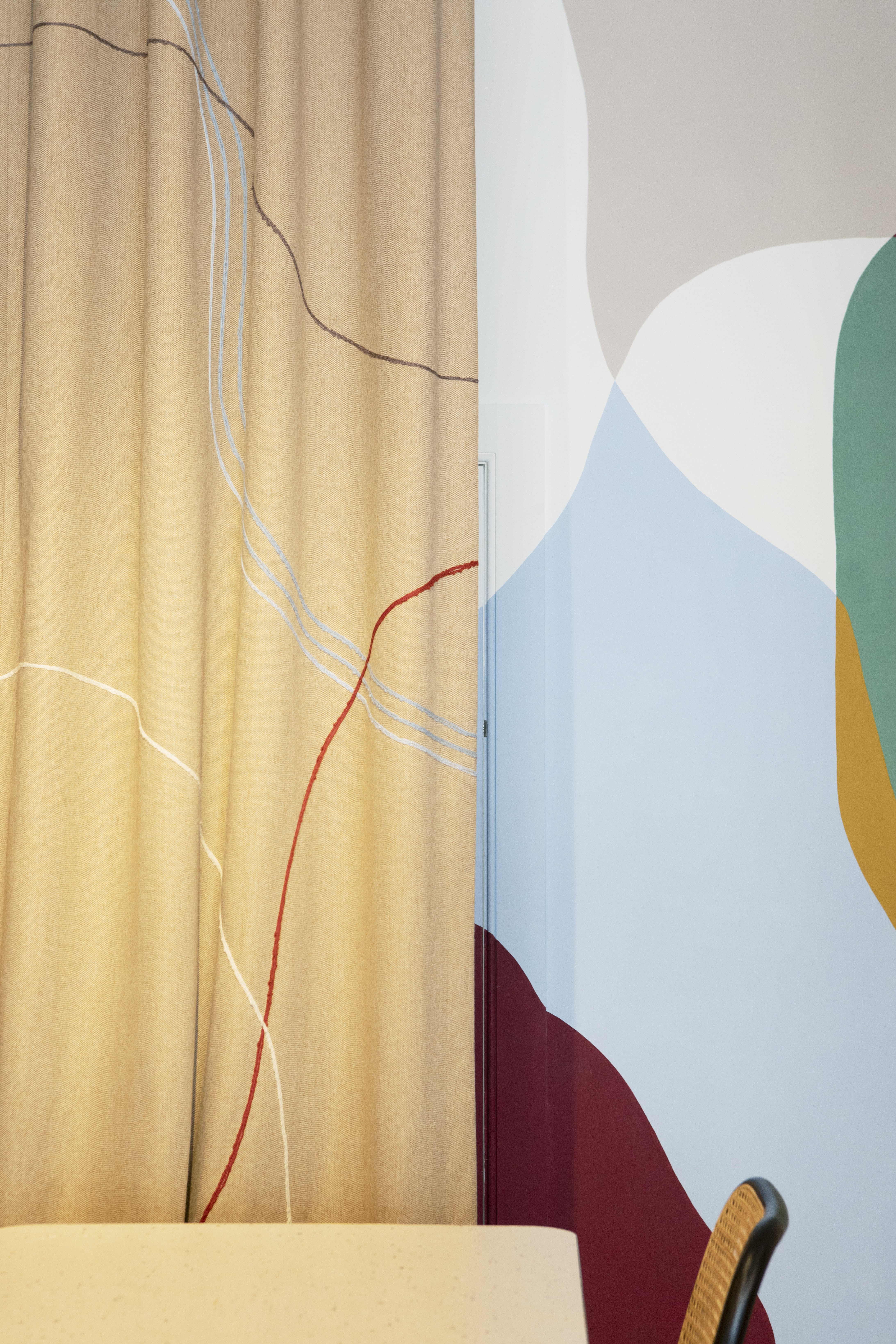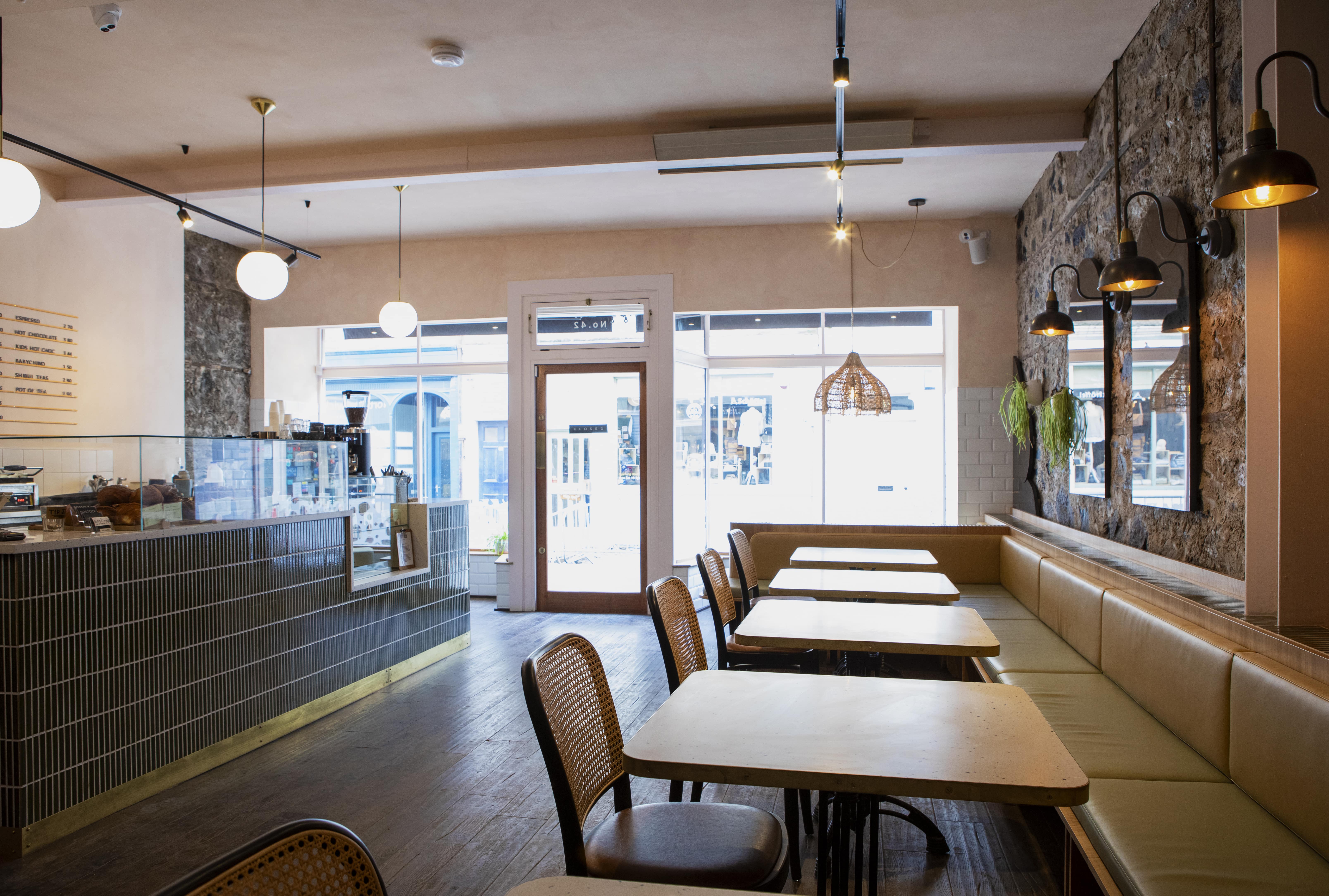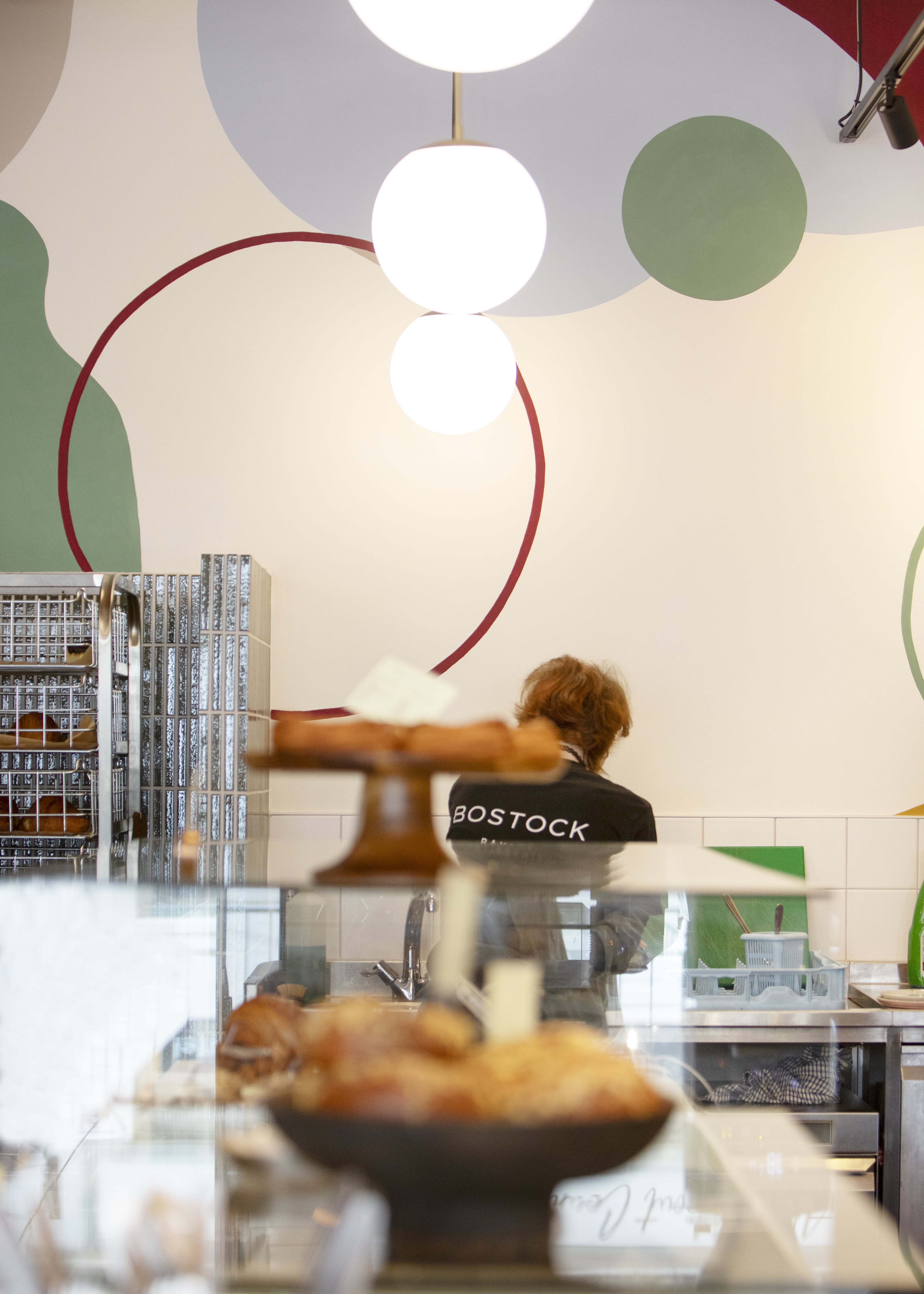 A new entrance and reconfigured window layout flood the bakery with natural light, framing a custom mural and tapestry by a local artist that echo the earthy tones of the interior. Lighting is layered with globe pendants and industrial lines highlighting the interior and Bostock’s signature pastries.