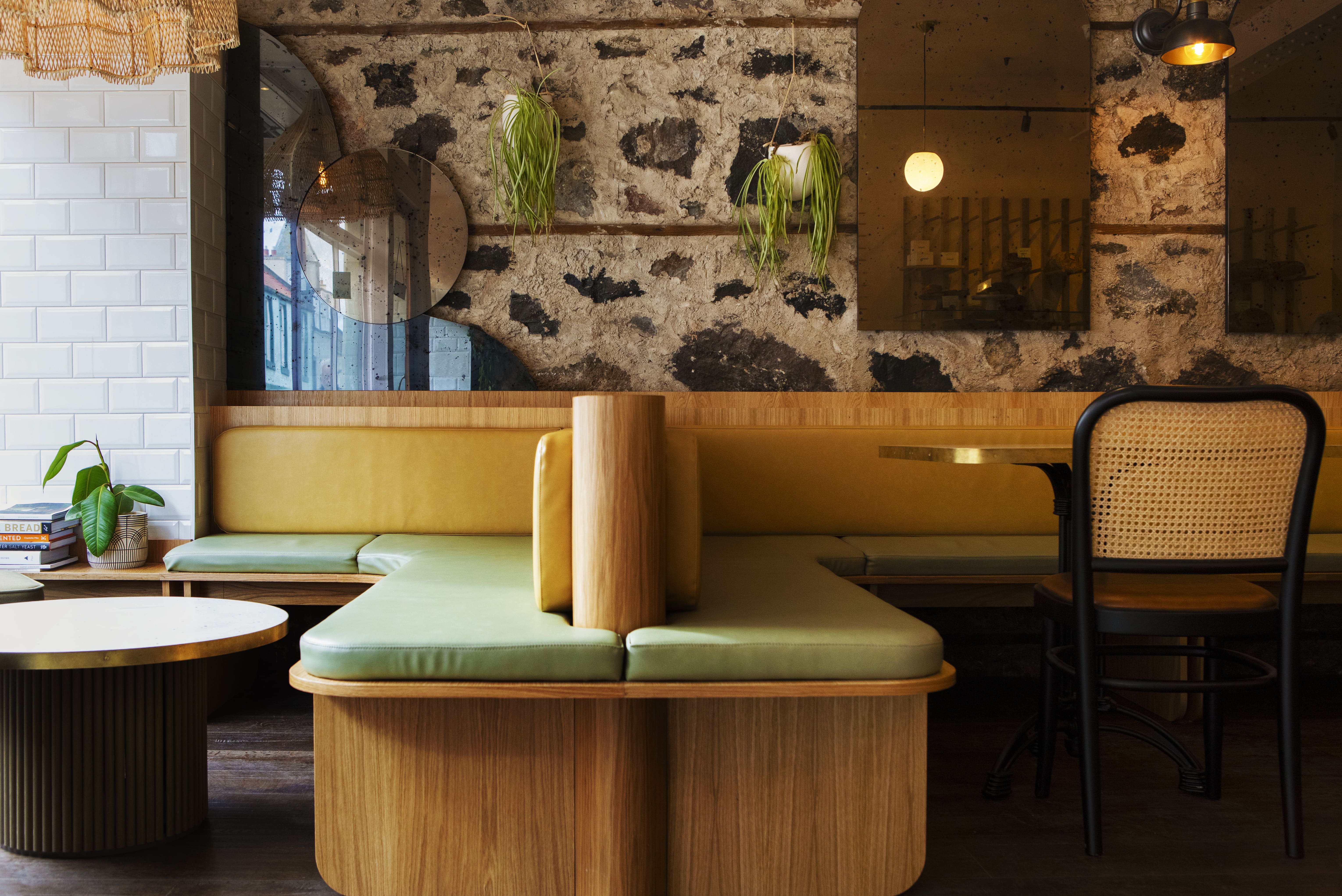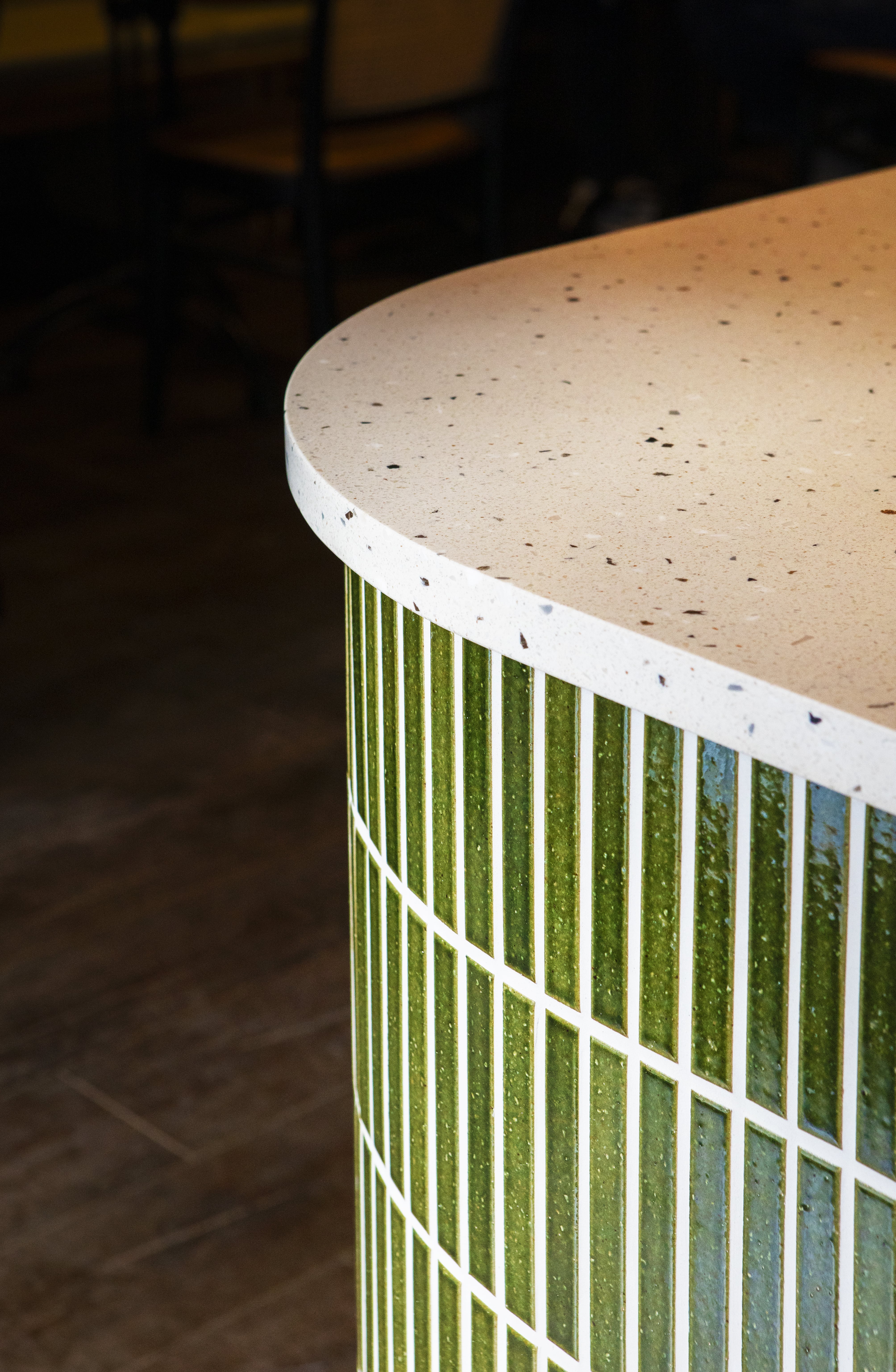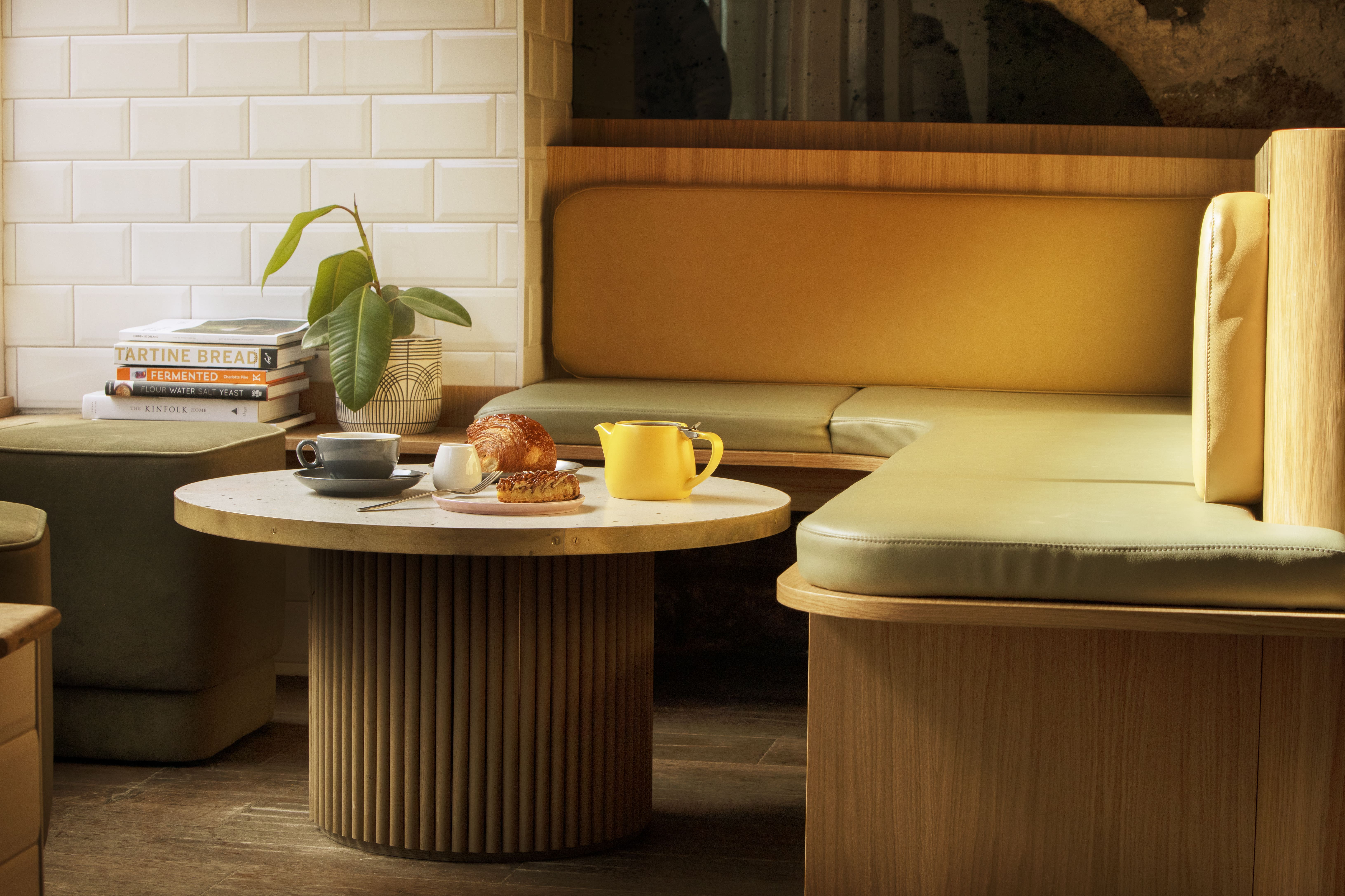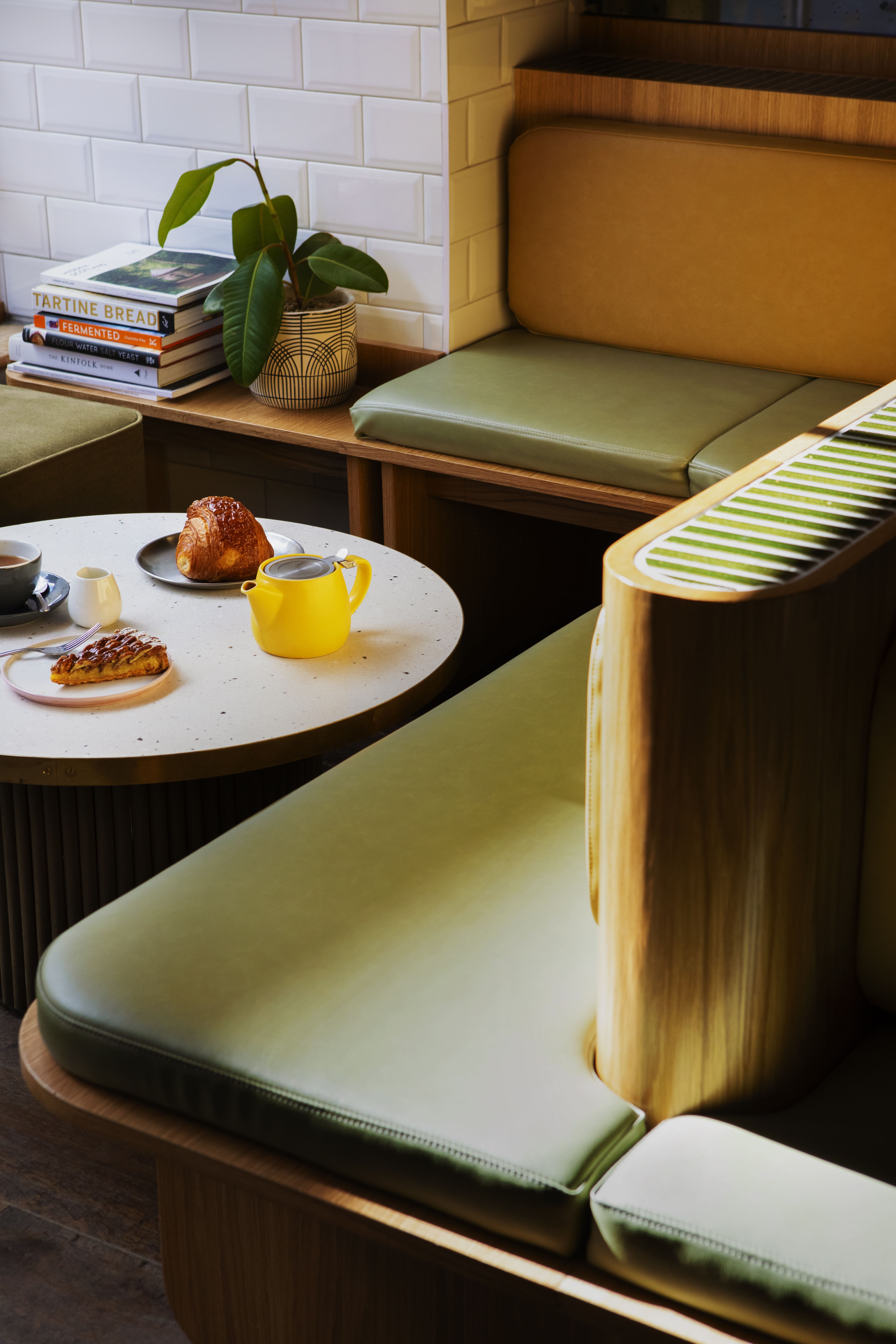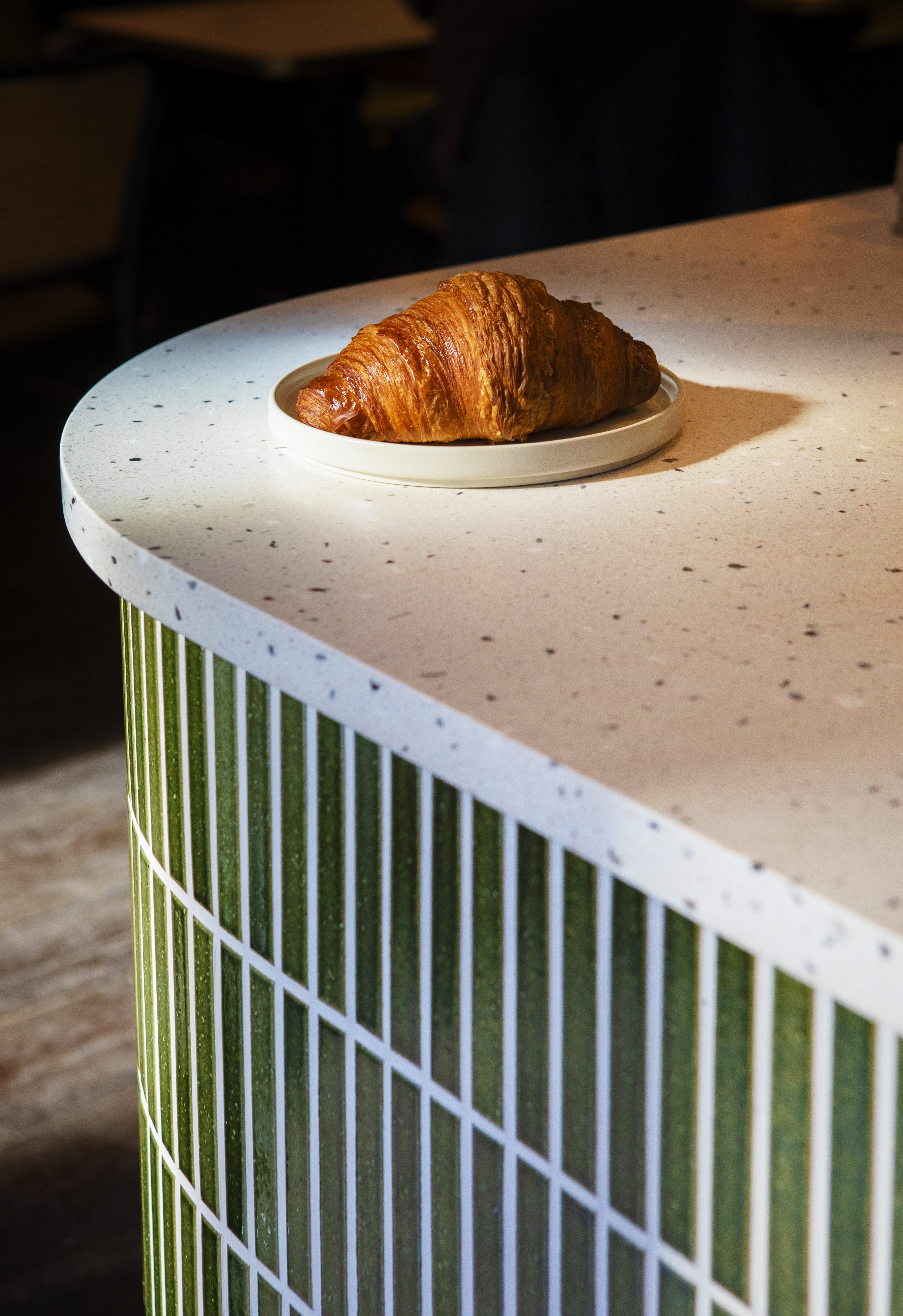 At the heart of the space sits the curved service counter. Clad in sage green vertical tiles with a brass kick plate, and topped in Hi-Macs terrazzo, the counter balances precision with playfulness, and glass display cabinets showcase Bostock’s artisanal bakes. This juxtaposition of rustic stonework and detailed joinery tells the story of tradition meeting contemporary craft.