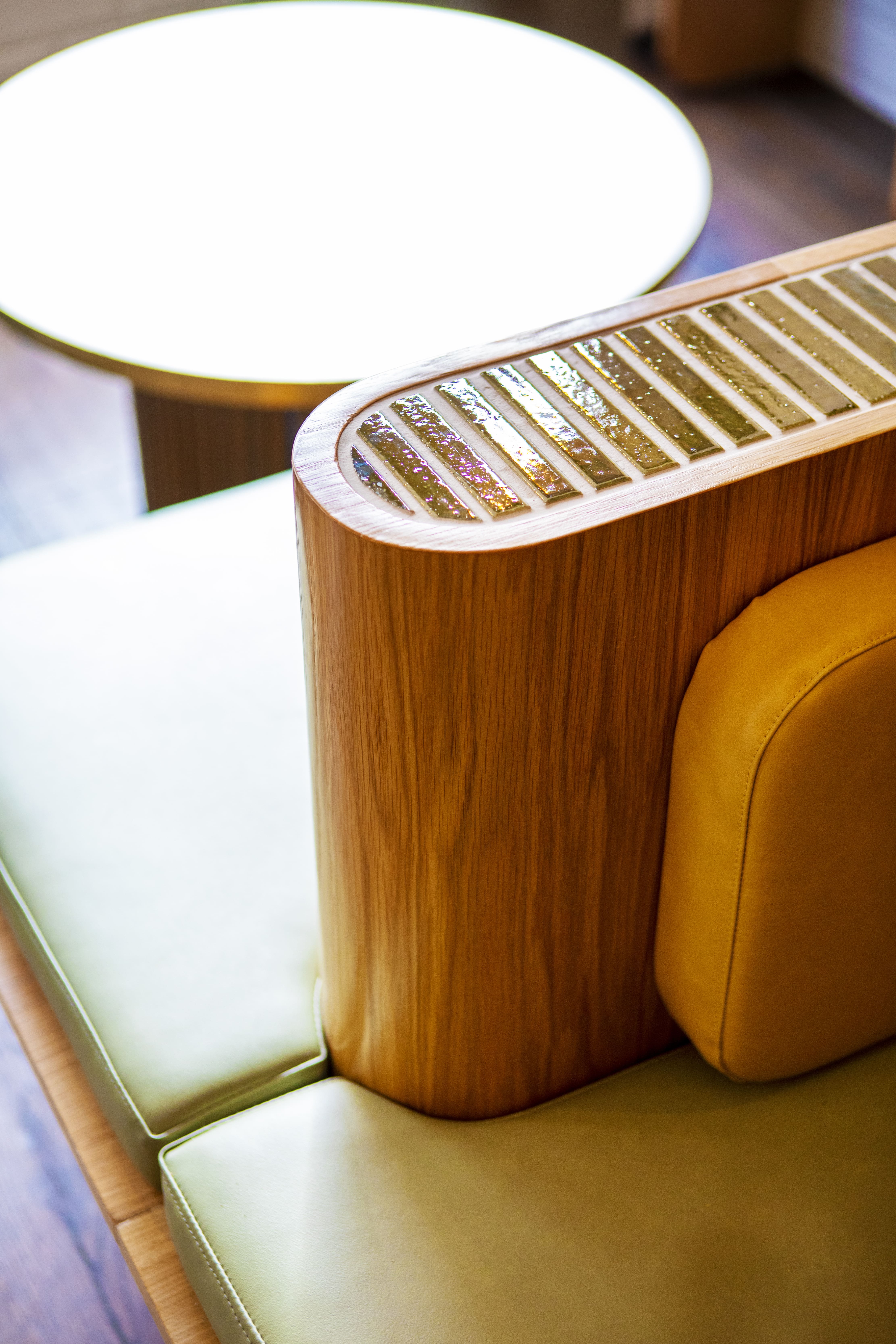The result is a space that harmonises architectural heritage with contemporary comfort. Exposed stone walls frame a calm palette of natural oak, terrazzo, and Bauwerk plaster, creating a serene backdrop for the space. Bespoke curved banquette seating, upholstered in soft green and mustard leather, offers intimate gathering spaces while maximising floor plan efficiency. Custom fluted oak tables with terrazzo tops add tactile depth, while woven rattan pendants cast a warm light throughout. Materials and finishes were carefully considered, from tiled inlay details to smoked and bronzed mirrors, to create an interior that feels timeless and distinctly Bostock.