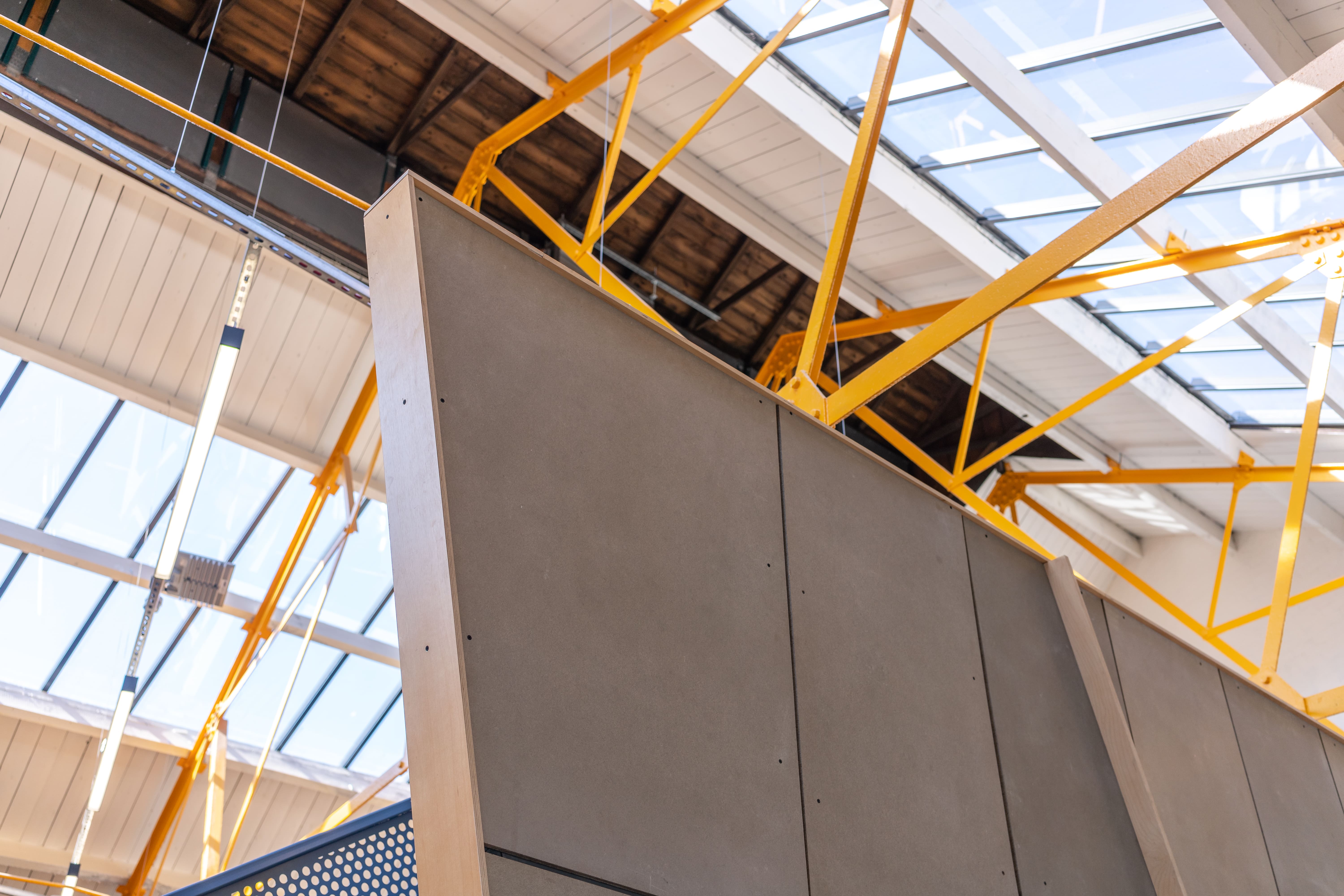 We developed a modular prefabricated panel system, clad with lacquered plywood internally and exterior Cempanel. The panels are tied with a ring beam which supports the exposed rafters and is insulated from above. A key feature is a staircase made from custom perforated steel parts. Along with the rafters and stairs, the colours in the Hellerup seating and presentation space are reminiscent of Federation Blue.