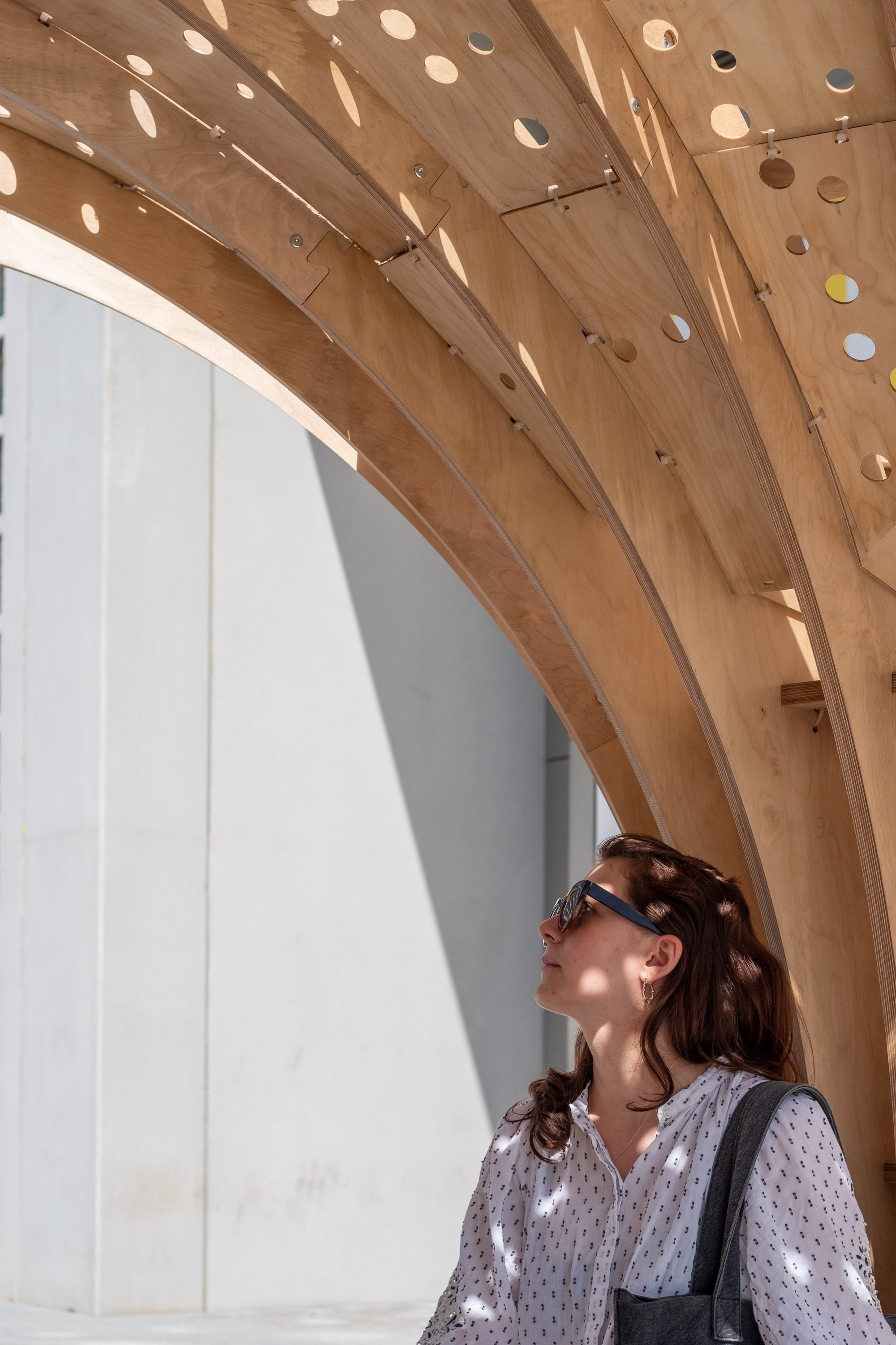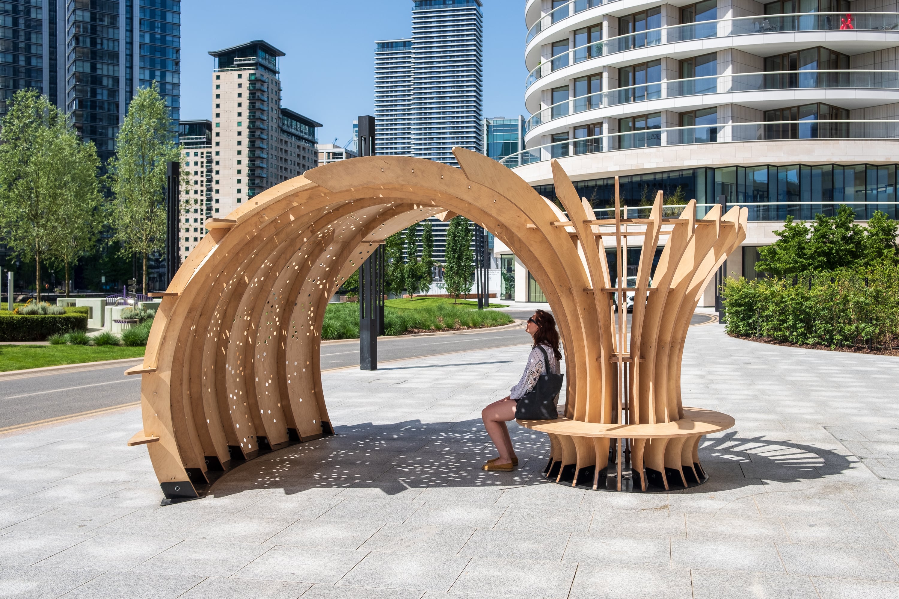 Initially commissioned for Canary Wharf’s Summer Lights, the installation was fabricated using CNC-cut timber panels, perforated with patterns based on celestial maps above the site. These perforations created dynamic light and shadow effects throughout the day, adding a responsive visual element to the structure. The urban setting required a high level of precision and efficient installation logistics, which were addressed through modular construction and off-site pre-assembly.