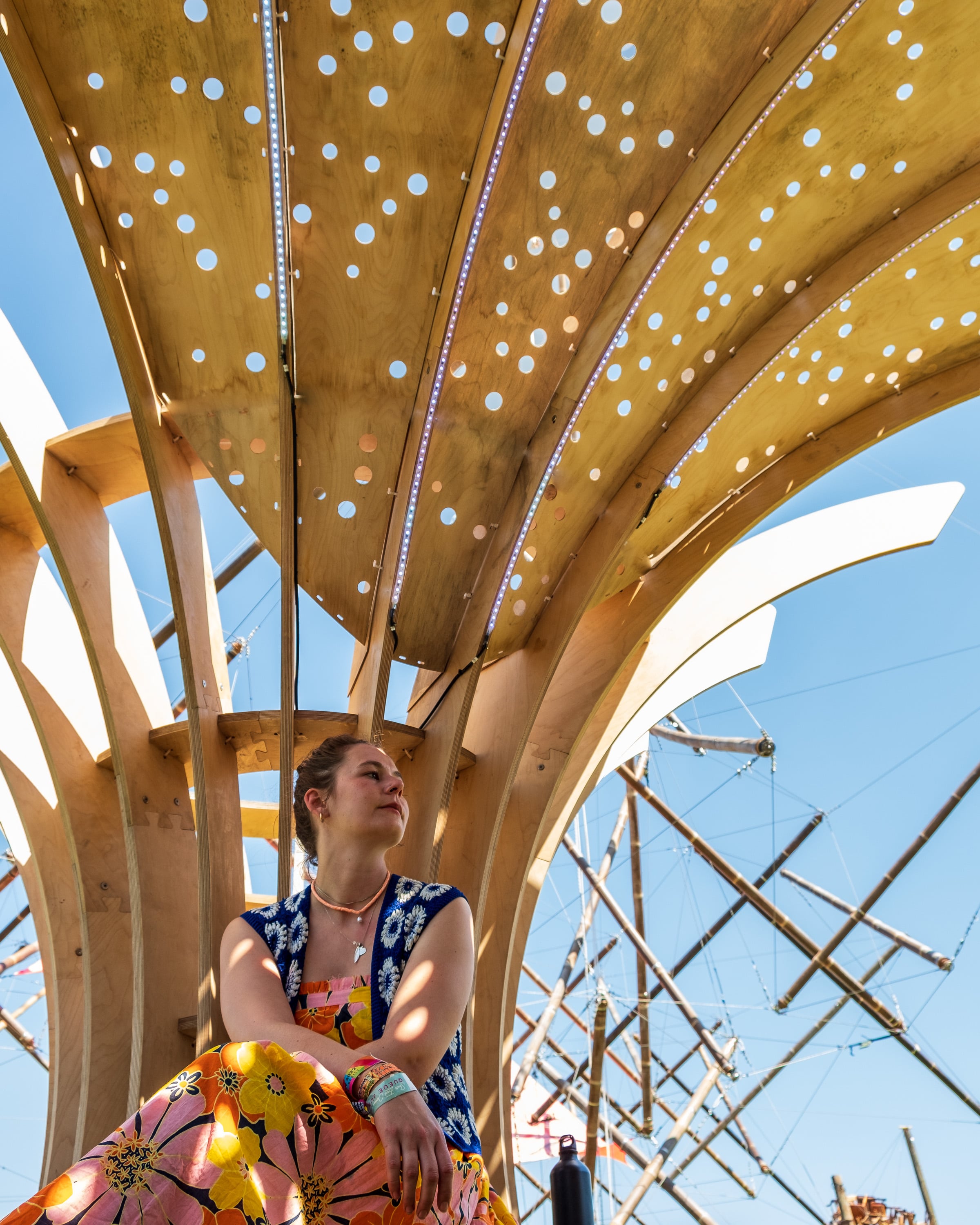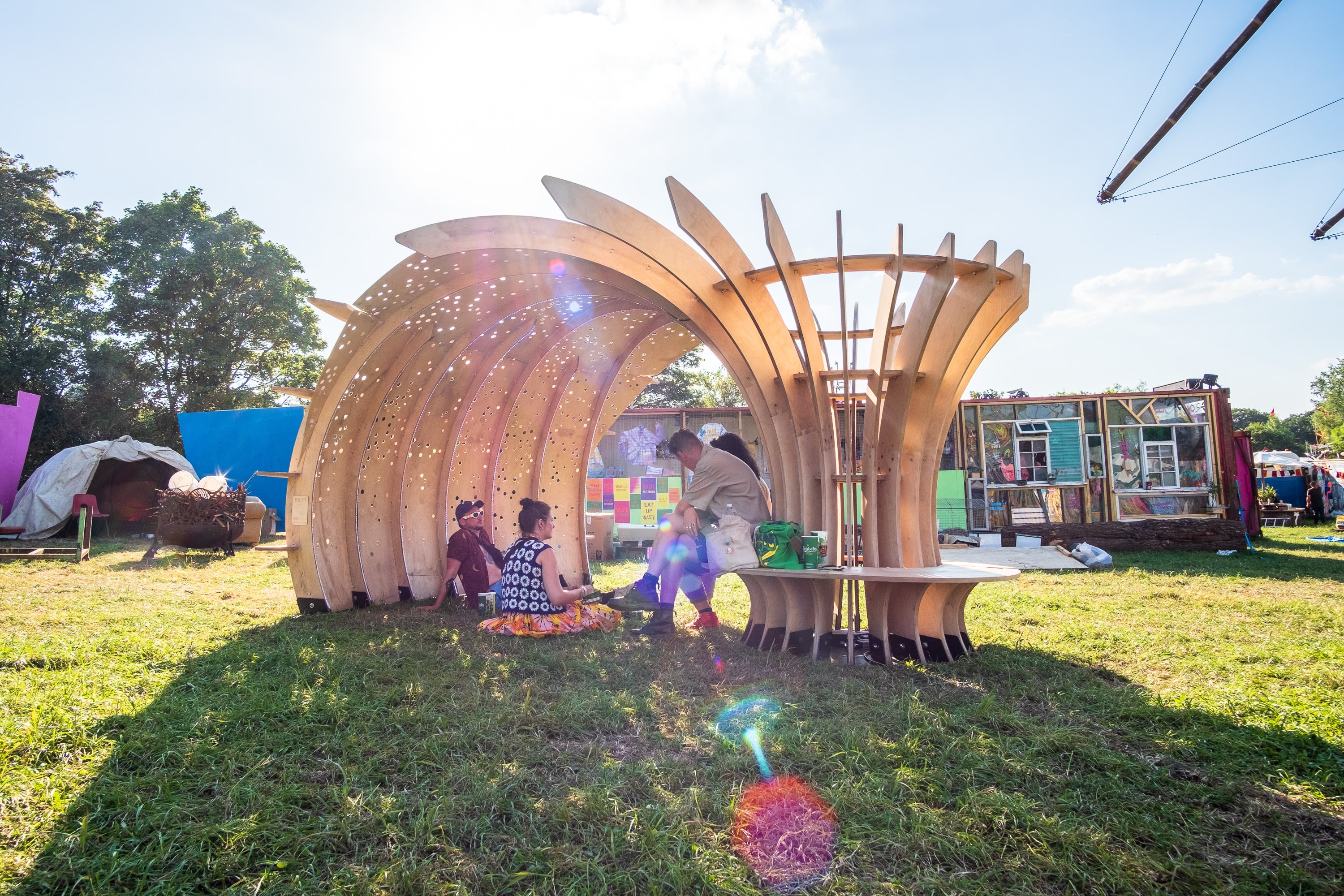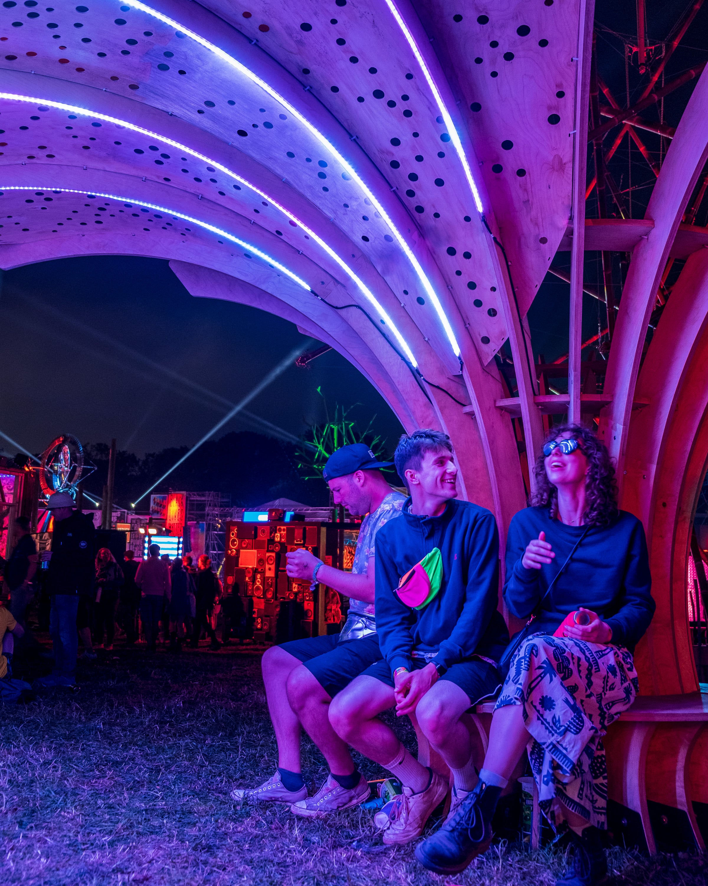 The structure was later reinstalled at Glastonbury Festival, where it required technical adjustments to withstand open-air conditions and high visitor interaction. Raskl reinforced key components, adapted fixings for ease of transport and rapid assembly, and ensured the structure’s durability across variable weather conditions. In the festival setting, Kilpi transitioned into a more immersive experience, with internal lighting transforming the structure into a beacon after dark.